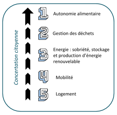 A la demande du ministère de la Transition Ecologique et Solidaire, il a été proposé de recentrer les thématiques en lien avec une dizaine de projet phares sur les orientations à définir au vue des projets retenus. Le ministère avait demandé de choisir un seul axe de travail (ex : la méthanisation, ou l’alimentation), et c’est le PETR qui a choisi de décliner le concept de Transition Écologique en plusieurs axes, considérant que restreindre ce concept à un de ses outils n’aurait pas fait sens sur le territoire, la transition étant transversale à de nombreuses thématiques. Les axes de travail envisagés sur la période de contractualisation (4 ans) pour répondre à la stratégie globale définie précédemment figurent sur l'image ci-contre.