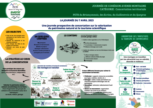 Dans le cadre du programme Avenir Montagne, en partenariat avec le réseau Nature Science Environnement, a été organisée le vendredi 7 avril 2023 une journée de prospective sur la valorisation du patrimoine naturel et le tourisme scientifique.