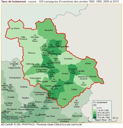 La surface boisée se répartit entre 84% en forêt publique et 16% en forêt privée. Les forêts communales sont moins productives (3,3 m3/ha/an) que les forêts domaniales et privées (4,6 et 4,1 m3/ha/an). Le taux de production des forêts privées s’explique par leurs situations en bas de versant à des altitudes plus basses où la potentialité forestière est meilleure. Le capital sur pied est cependant moins important en forêt privée : il est de 130 m3/ha contre 160 m3/ha pour la forêt publique ; cette différence s'explique très certainement par le fait que celle-ci est une forêt relativement jeune, issue de la déprise agricole. La forêt privée est extrêmement morcelée : il est fréquent de trouver des parcelles d’environ 500 m2 avec de nombreux bien non délimités, indivisions, succession non réglées…