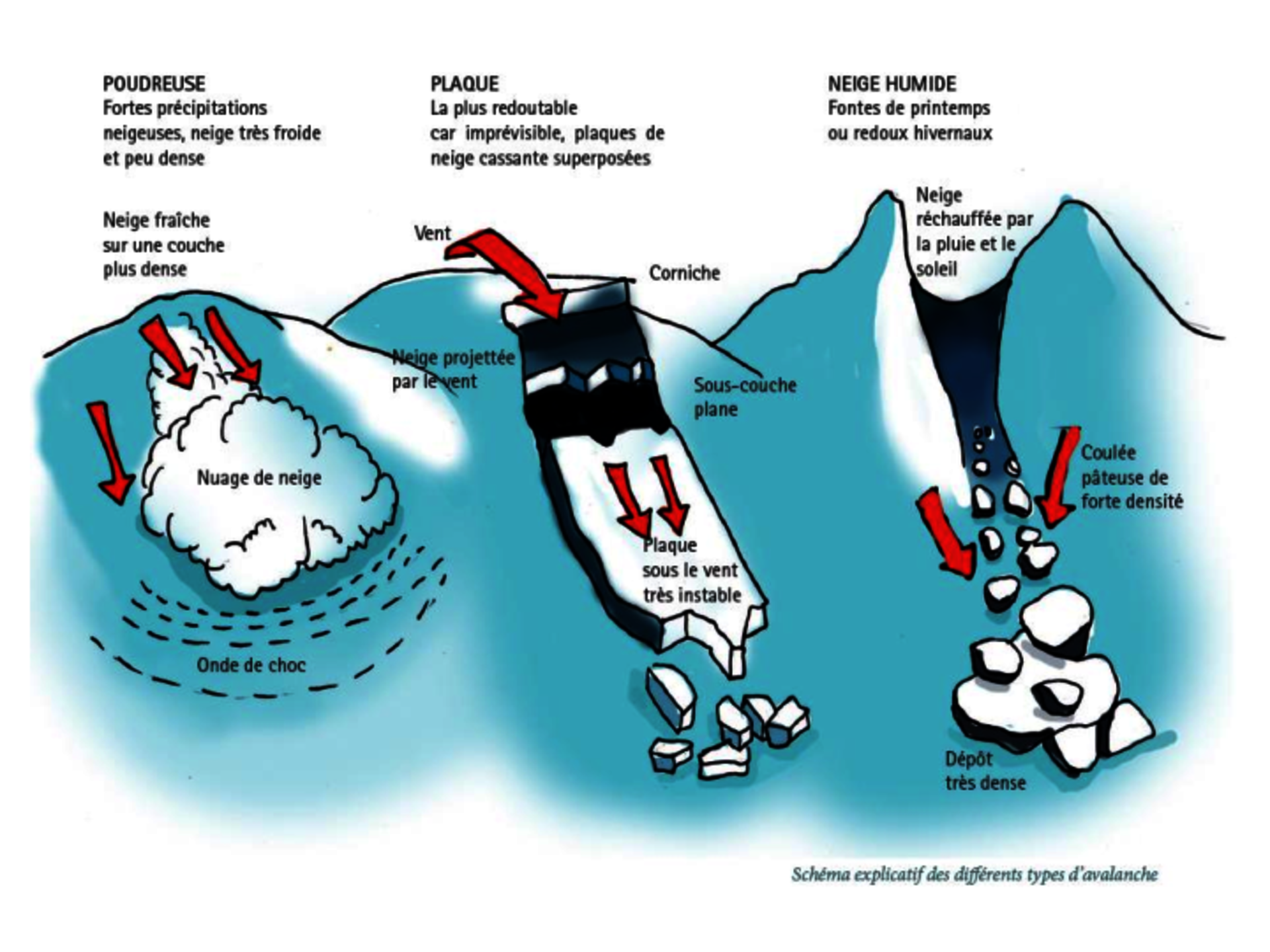 - Une phase aérosol composée par une grande quantité d’air et une petite quantité de neige. Cet aérosol génère des pressions importantes par le déplacement d’air et n’est que peu influencé par la topographie.
