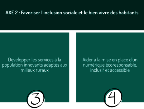 - L’autre, visant l’inclusion sociale et le bien vivre au travers du développement des services de proximité, car la finalité est bien de maintenir un territoire vivant et qui donne à ses habitants les moyens nécessaires à leur épanouissement