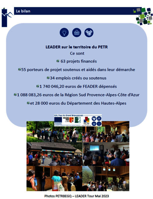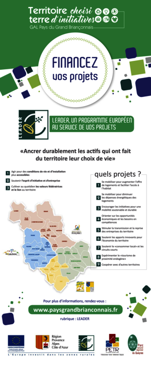 Le PETR Briançonnais, Ecrins, Guillestrois, Queyras a été retenu pour porter le programme LEADER 2014-2020. Le territoire dispose d'une enveloppe financière alimentée par le FEADER (Fonds Européen Agricole pour le Développement Rural ) d'1 500 000 € et de contreparties publiques nationales (provenant principalement de la Région Provence-Alpes-Côte d'Azur).