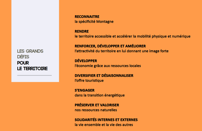 Il va ainsi proposer les orientations stratégiques et les conditions de développement économique, écologique, culturel et social du territoire. Dans ce cadre, une réflexion sur les enjeux, spécifiques au territoire de montagne, est apportée pour assurer une cohérence entre les différentes politiques des communes du PETR.